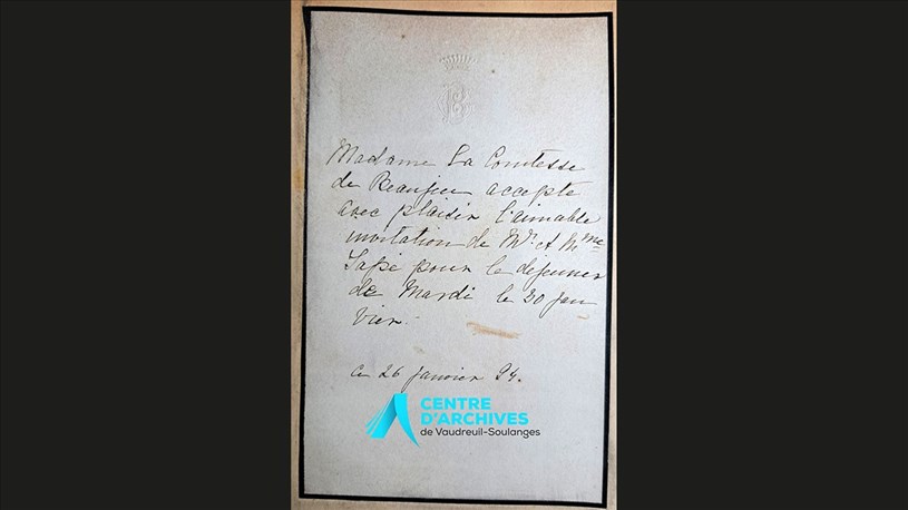 Carton réponse d’acceptation de l’invitation au mariage de la part de Mme la Comtesse de Beaujeu, 26 janvier 1894.