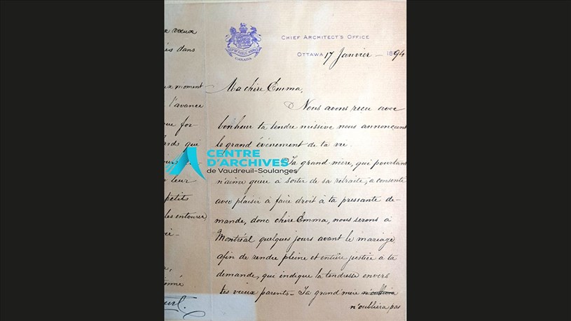 Confirmation de réception de l’invitation au mariage et envoi de vœux aux mariés, car il n’a pu assister au mariage, de M. Schultz de Winnipeg, 1er février 1894.