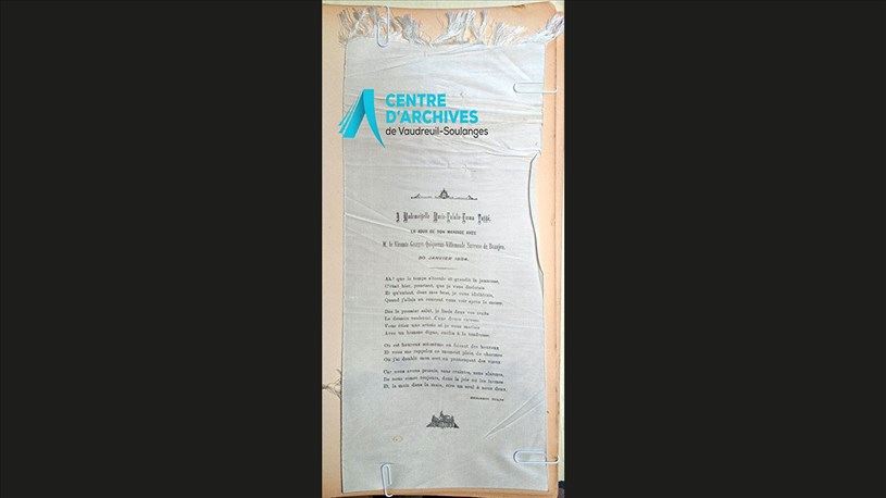 Poème écrit par Benjamin Sulte imprimé sur un tissu et offert aux mariés.