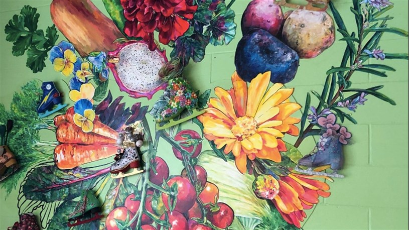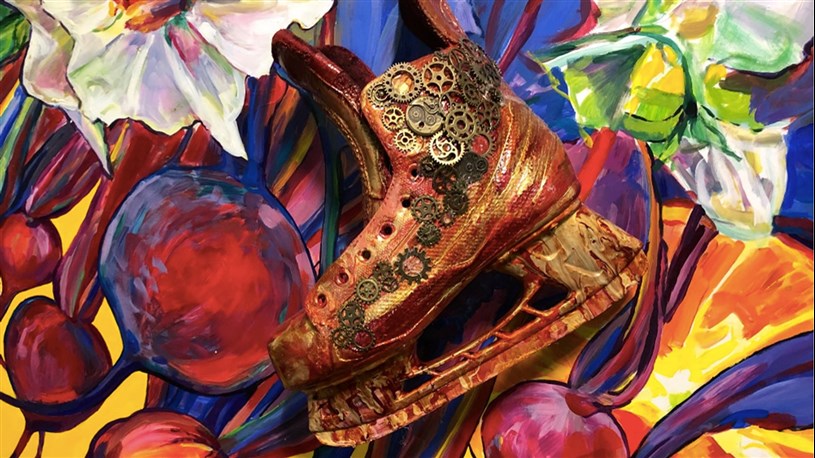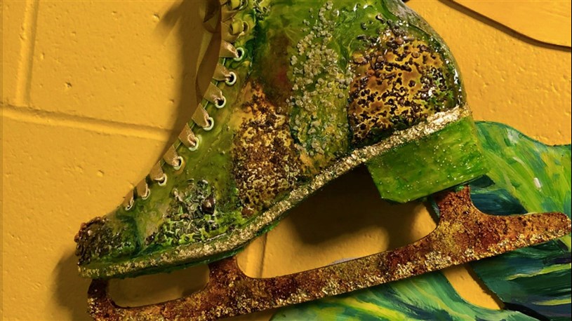 L’artiste Madeleine Turgeon s’est affairée au cours de la dernière année à créer une œuvre représentative de cet espace de restauration situé dans un lieu à vocation sportive. Une trentaine de citoyens ont participé au projet en transformant des patins usagés en pièces artistiques toutes plus originales les unes que les autres. Ces patins nouveau genre ont été insérés dans les fresques réalisées par Mme Turgeon à même les murs de l’aréna.