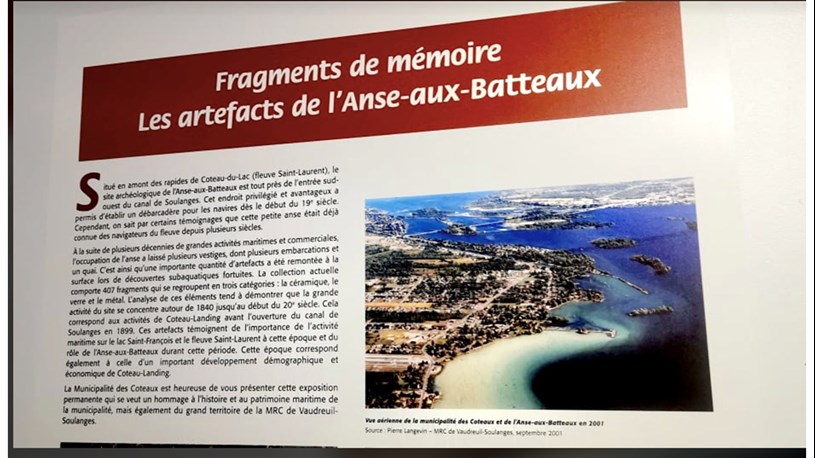 Les visiteurs pourront y observer plus de 100 pièces originales répertoriées en selon différentes catégories d’artefacts comme des pipes en argiles, des bouteilles en verre, des poteries, de la vaisselle et des objets de la vie de tous les jours. Ajoutons à celles-ci l’histoire de plusieurs vestiges maritimes. À cet effet, Sébastien Daviau, responsable des collections et de la recherche auprès du Musée régional de Vaudreuil-Soulanges et chargé de projet pour cette exposition évoque « À la suite de plusieurs décennies de grandes activités maritimes et commerciales, l’occupation de l’anse a laissé plusieurs vestiges, dont plusieurs embarcations et un quai. C’est ainsi qu’une importante quantité de pièces archéologiques, dont la majorité provient du 19e siècle, ont été remontées à la surface lors de découvertes