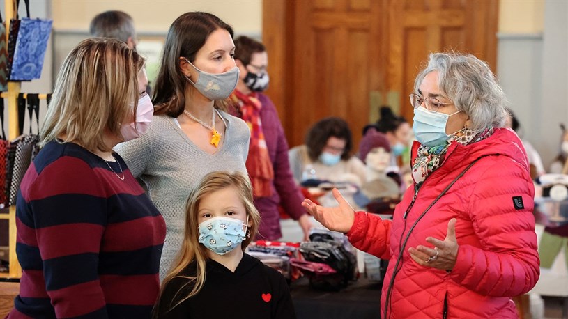 Les exposants, qui continuaient de travailler sur leur art à certains moments, ont reçu la visite de la députée de Salaberry-Suroît, Claude DeBellefeuille, qui en a profité pour discuter avec Mme Labre et sa fille.