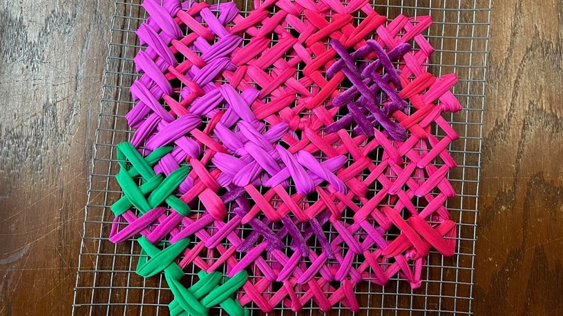 Le canevas de cette grande fresque de près de huit mètres est constitué d’une vingtaine de panneaux de grillage métallique auxquels sont noués, en point de croix, des bandes de tissus, aux couleurs de L’Actuel.