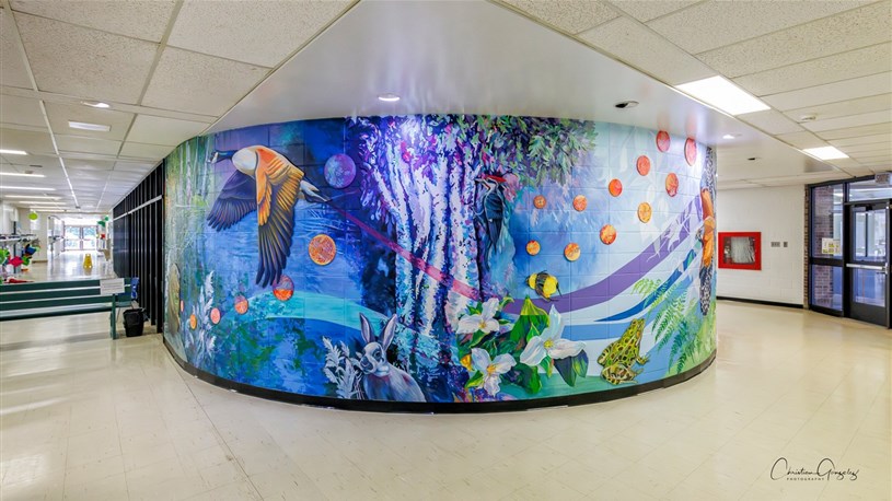 Mme Turgeon relate un peu l'histoire de la création de l'oeuvre : « Les élèves de l’école Mount Pleasant ont participé à la réalisation d'une murale (35 x 8 pi) située dans le hall d’entrée avec l'utilisation de quelques grands animaux découpés dans 3 panneaux de PVC.