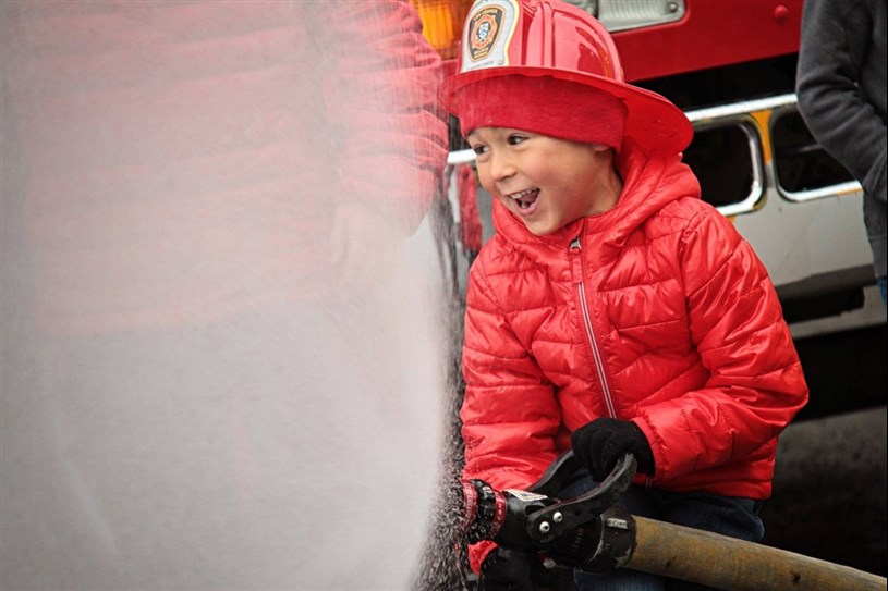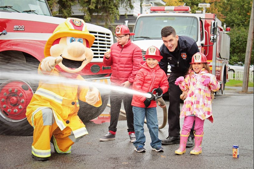 La mascotte Yvon Larosé était présente pour le plus grand bonheur des enfants sur place, comme le jeune Xavier, qui s'est improvisé pompier en s'amusant avec la lance.