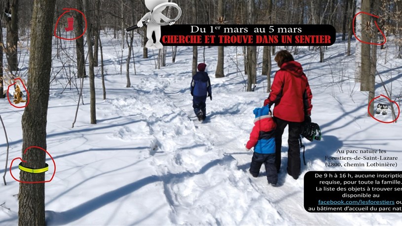 Du 1er au 5 mars 2021, de 9 h à 16 h, l’équipe du parc nature les Forestiers-de-Saint-Lazare invite les familles à participer au jeu cherche et trouve grandeur nature.