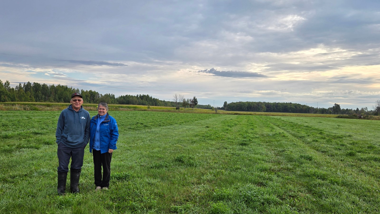 « C'est ma conjointe Brigitte Héroux qui m'a parlé de cette initiative et qui a suggéré qu'on y prenne part. Elle aime vraiment beaucoup les oiseaux. Ça ne change pas grand-chose pour nous puisque le projet consiste à retarder la fauche sur une superficie d'environ 1 hectare alors que notre ferme en compte 80. Je loue aussi 50 hectares pour un grand total de 130 hectares.  C'est un petit geste pour aider l'environnement et protéger les oiseaux, des goglus des prés qui sont en pleine période de nidification », explique M. Leroux qui exploite une entreprise agricole située sur le chemin Saint-Grégoire aux Cèdres depuis plusieurs décennies.