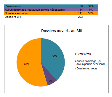 À Rigaud, en date du 14 février, 111 dossiers étaient toujours en cours au Bureau du rétablissement-inondations (BRI). Seulement 78 permis ont été émis. De ces 78 permis émis, 14 % (11 permis) sont pour la démolition alors que 45 (58%) sont pour effectuer des rénovations.