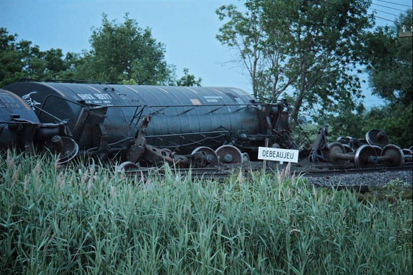 L'homme ayant 25 ans d'expérience nous indiquait n'avoir jamais vu un déraillement aussi important. Se sont des wagons-citernes transportant du propane liquide qui ont déraillé. Heureusement, on aucune fuite n'a été détectée.