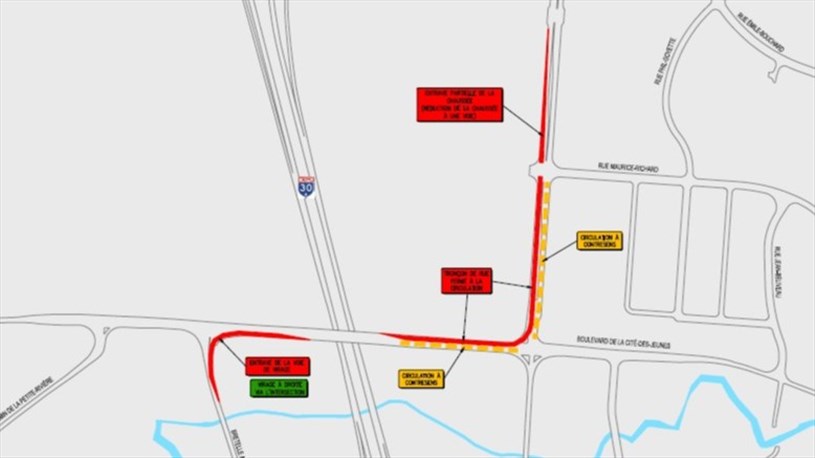Les premières entraves à signaler sont situées sur le secteur à l’ouest de l’autoroute 30. Du 20 au 30 avril 2026, une voie sur le boulevard de la Cité-des-Jeunes en direction Est sera fermée, et ce, entre le chemin de la Petite-Rivière et l’autoroute 30.