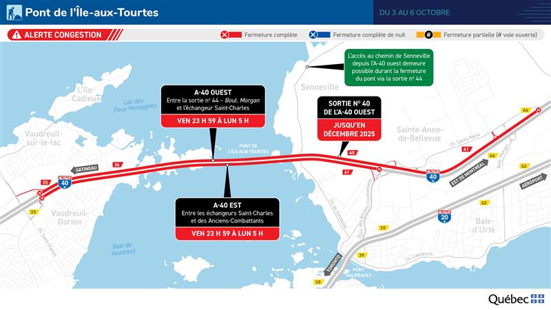 Le Ministère des Transports et de la Mobilité durable a annoncé une fermeture complète du pont de l’Île-aux-Tourtes dans les deux directions, du vendredi 3 octobre à 23 h 59 au lundi 6 octobre à 5 h, pour permettre des travaux de reconfiguration et de maintenance.