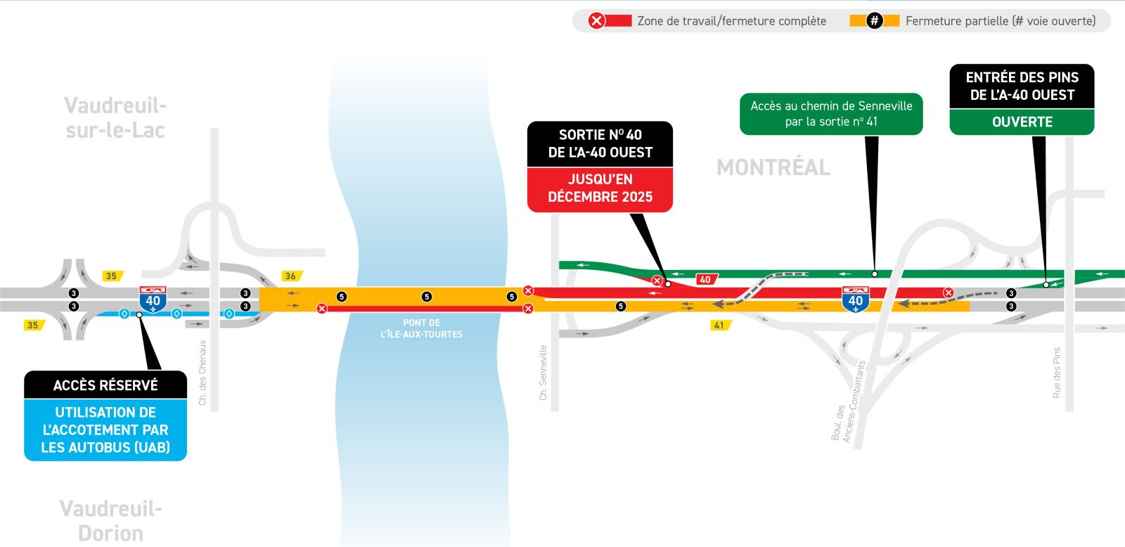 Malgré cette fermeture, l’accès au chemin de Senneville sera maintenu via la sortie 44 en provenance de l’A-40 ouest. Les travaux incluent la reconfiguration des bretelles de l’A-40 ouest, ainsi que des opérations d’asphaltage et de bétonnage.