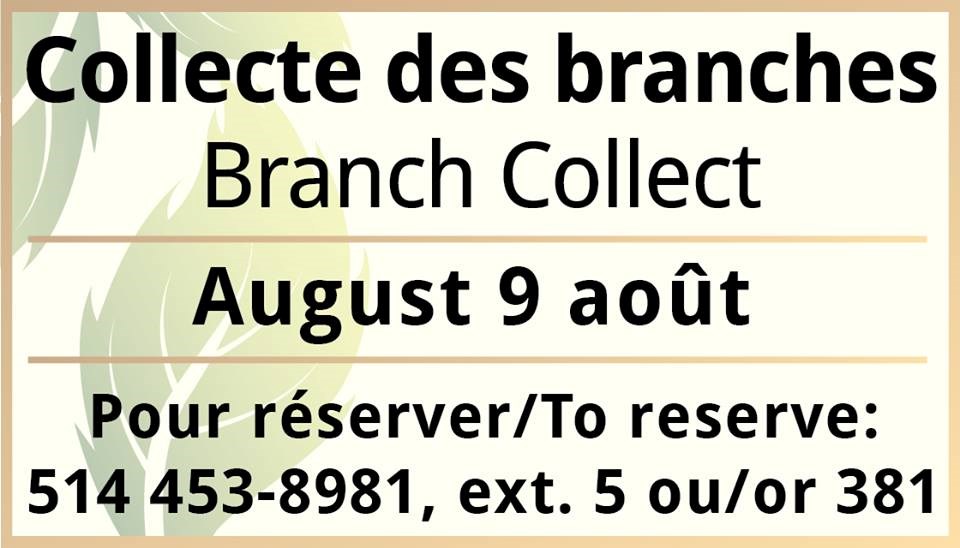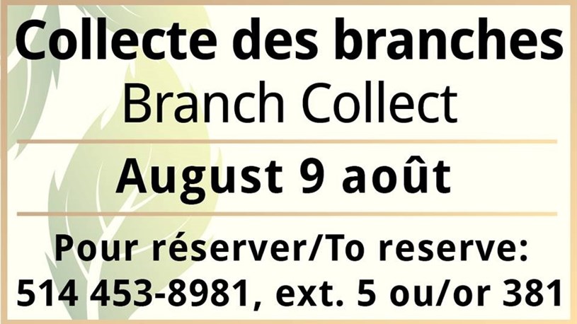 La prochaine collecte des branches sera le 9 août. On peut réserver son ramassage en communiquant au 514-453-8981, poste 5 ou 381.