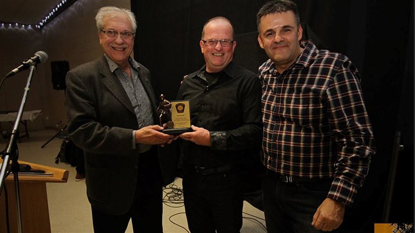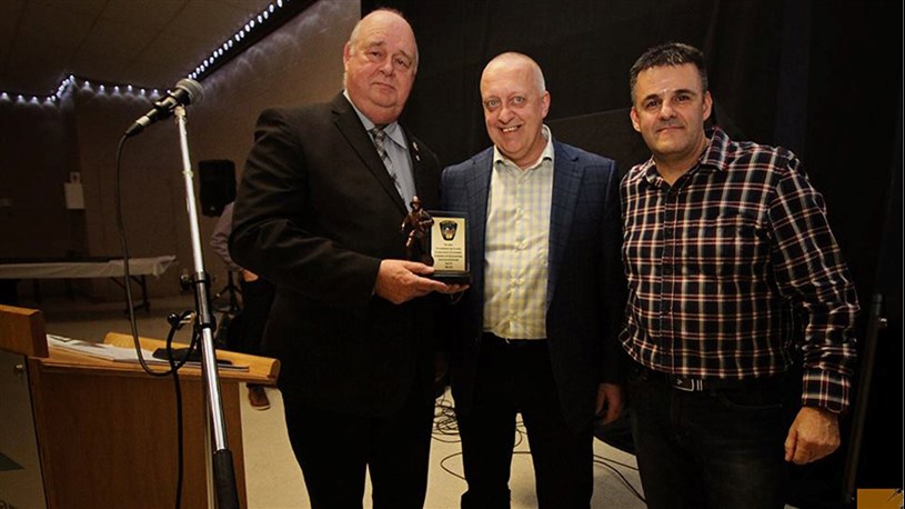Le maire de Saint-Polycarpe, Jean-Yves Poirier a décerné une plaque au retraité Alain Gauthier cumulant 43 ans de service au sein de la brigade incendie de la municipalité. Ils sont accompagnés par le directeur des trois bridages régionales, Michel Bélanger.