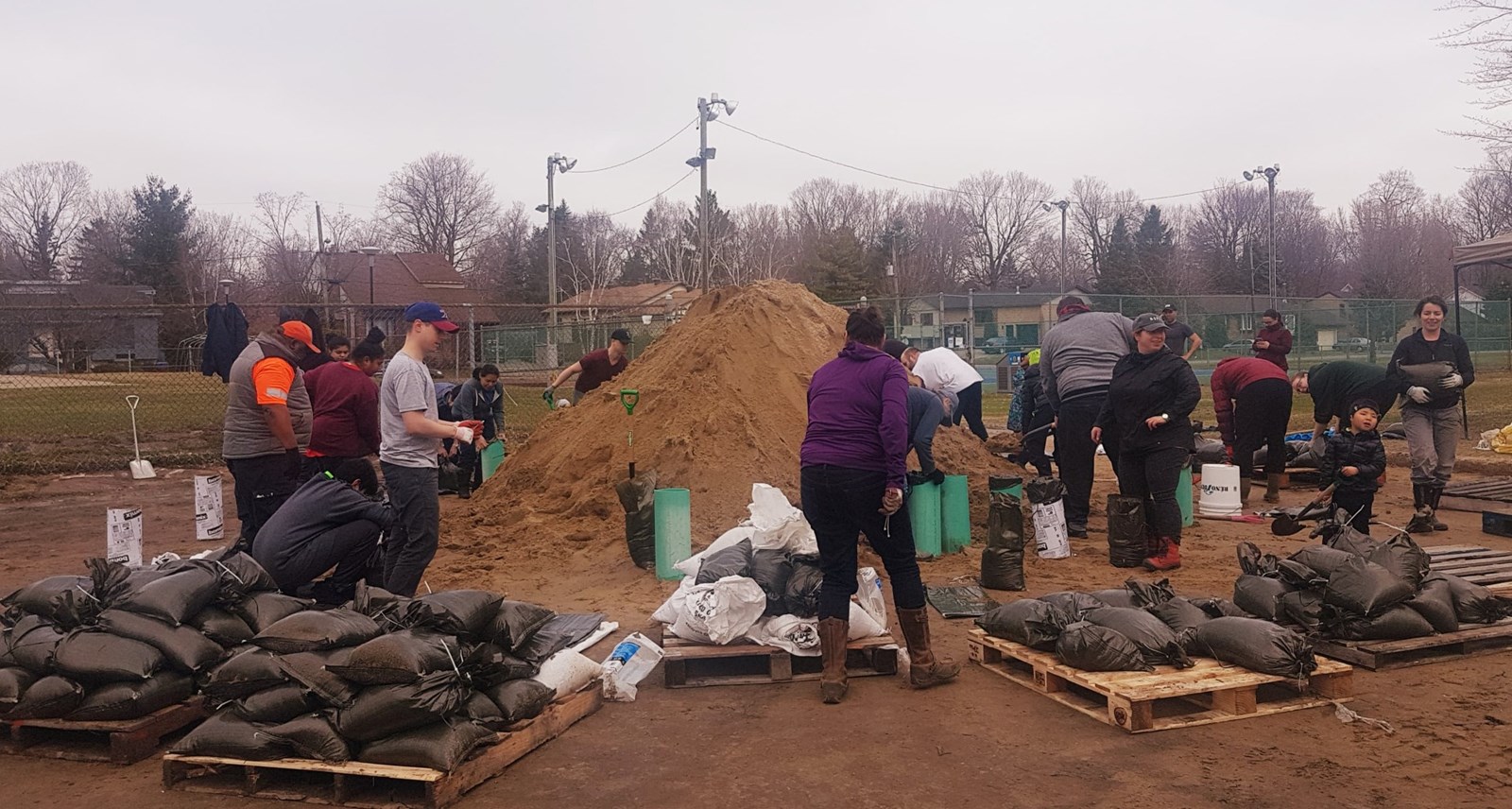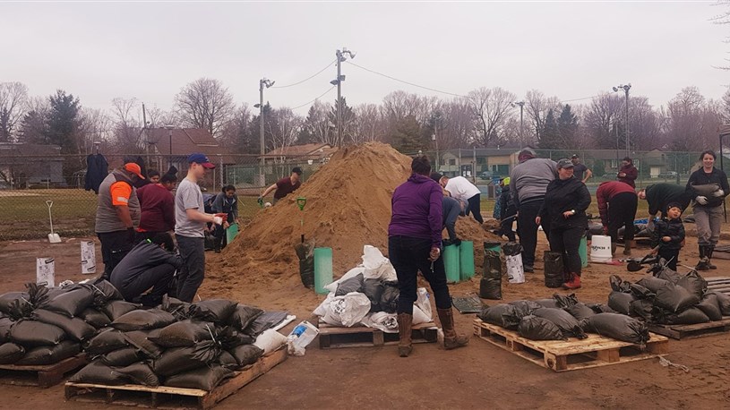 Plusieurs dizaines de bénévoles se sont rassemblés dimanche matin à Terrasse-Vaudreuil afin de remplir et distribuer des sacs de sable.