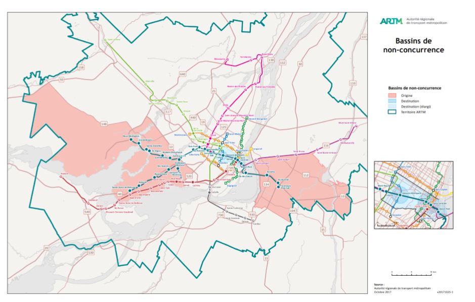 L'accord d’intégration entre l’Autorité régionale de transport métropolitain (ARTM) et le REM comprend en effet un principe de bassins de non-concurrence, qui consiste à ne pas établir de lien direct entre les zones concernées, soit le bassin de Deux-Montagnes, Sainte-Anne-de-Bellevue, la Rive-Sud et le centre-ville de Montréal.