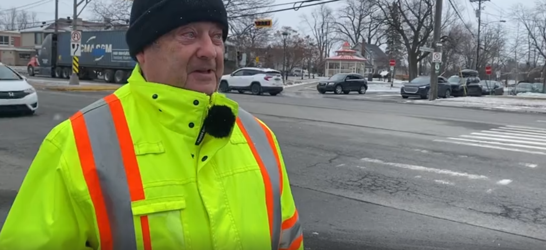 André Larivée est brigadier à l'intersection du boulevard Harwood, un tronçon de l’autoroute 20, et de l’avenue de la Fabrique, menant à l'école primaire du Papillon-Bleu. Chaque jour, il fait traverser une douzaine d’enfants sur l’une des routes les plus dangereuses du pays.