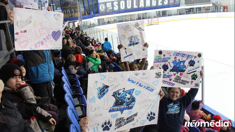 Mardi dernier à 11 h, le calme habituel du Centre sportif Soulanges a été bousculé par une foule d’une centaine d'élèves venue encourager son équipe. Dans le cadre d’un match amical de la ligue de hockey primaire du centre de services scolaires des Trois-Lacs (CSSTL), les Coyotes de l'école du Val-des-Prés affrontaient les Aigles de l'école Brin d’Amour.
