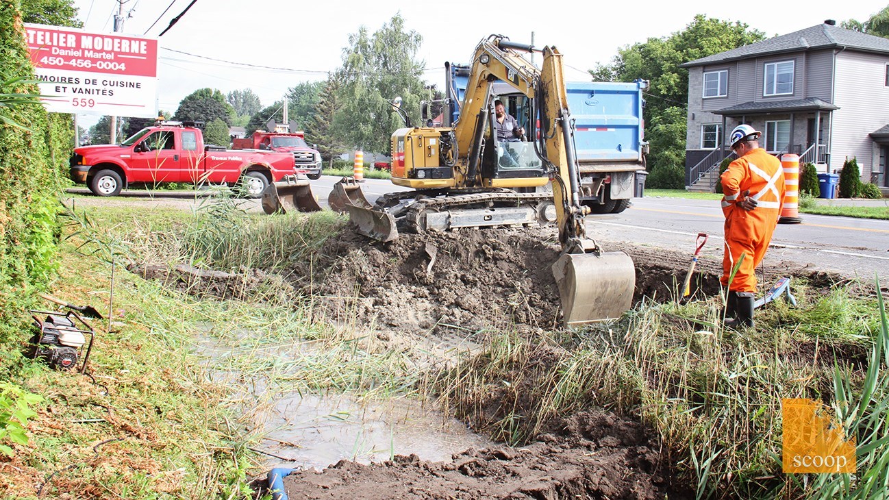 L’équipe des travaux publics de la Municipalité et un entrepreneur privé travaillent depuis tôt ce matin à colmater la fuite qui persiste depuis mercredi dernier. Si les citoyens sont peu affectés par le bris d’aqueduc, le réseau routier dans le secteur est quant à lui quelque peu affecté.