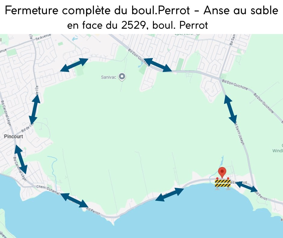 Pour le moment et jusqu’à la fin des travaux, aucune circulation n’est possible sur ce tronçon de rue. Le détour doit se faire par le boulevard Saint-Joseph, le boulevard Don-Quichotte, l’avenue Forest, le boulevard de l’Île et le boulevard Cardinal-Léger.