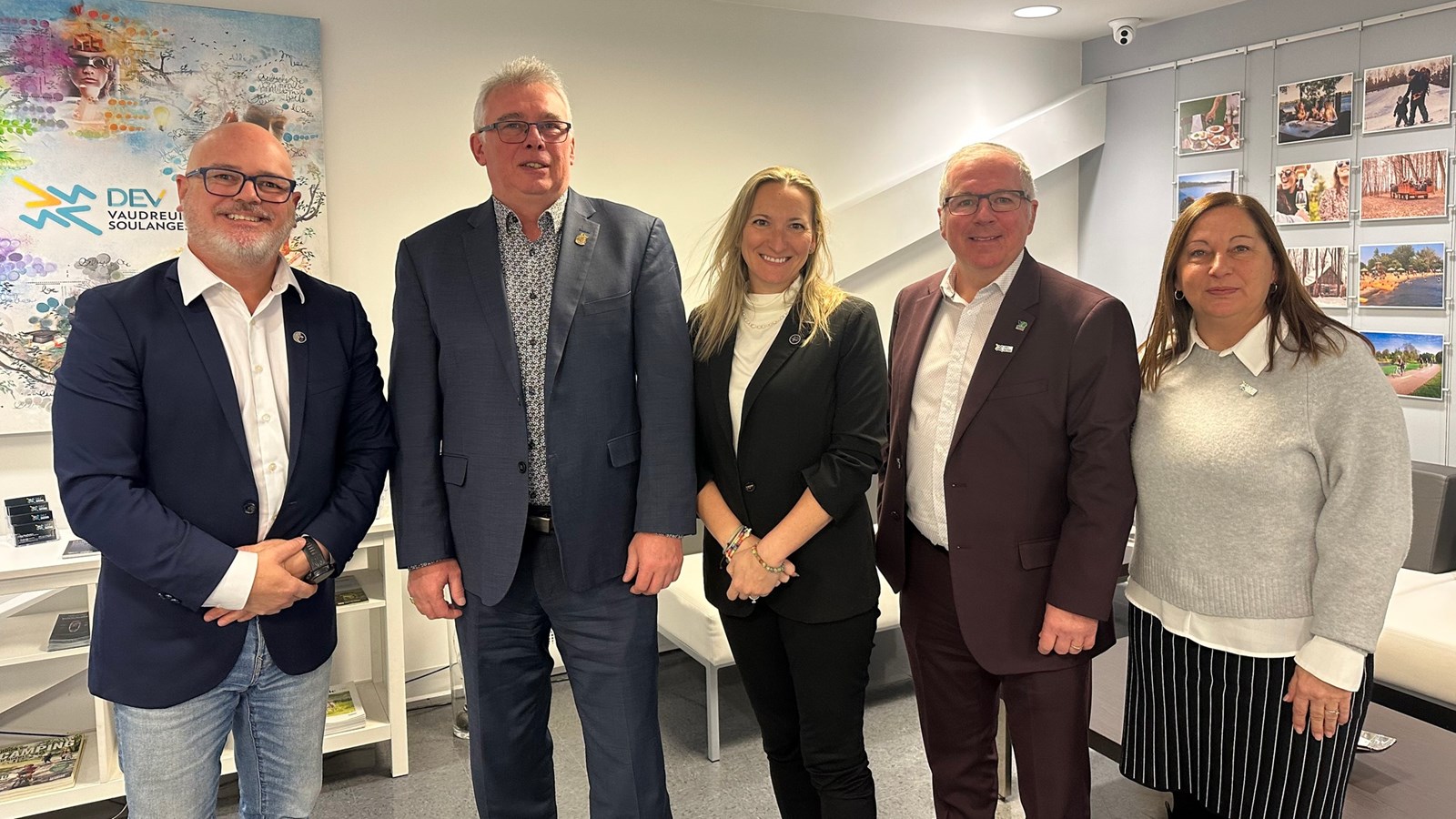 Le préfet de la MRC et maire de Rivière-Beaudette, Patrick Bousez, la mairesse de Notre-Dame-de-l'Île-Perrot, présidente de Développement Vaudreuil-Soulanges (DEV) et porte-parole des élus de l'île Perrot, Danie Deschênes, et le maire de Vaudreuil-Dorion, Paul Dumoulin, accompagnés du directeur général de la MRC, Alexandre Lambert, et de la directrice générale de DEV, Mme Joanne Brunet, ont eu l'occasion d’avoir des échanges productifs avec le ministre Julien, son équipe ainsi que Maryline Picard, députée caquiste de Soulanges.
