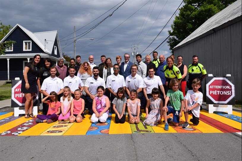 On y reconnaît notamment l’artiste Audrée Bourdeau qui a réalisé avec quelques jeunes de l’école Saint‐Étienne du marquage au sol à une traverse piétonnière. Le policier‐parrain de la municipalité, M. David Sanschagrin de la Sûreté du Québec, nous explique également les comportements sécuritaires à adopter à l’approche d’un passage piétonnier.