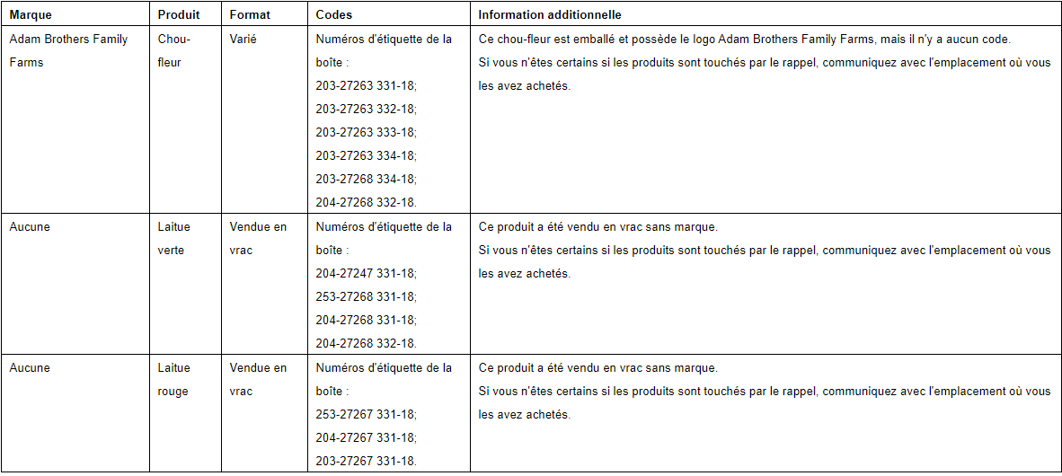 Les produits visés par le rappel sont produits par Adam Bros. Farming Inc. de Santa Maria en Californie et ont été importés au pays par Courchesne Larose Ltd, Anjou, QC; Dominion Citrus, Toronto, ON; Fresh Taste Produce Limited, Milton, ON; and Fruits et Légumes Gaëtan Bono Inc., Montréal, QC. Les consommateurs, les détaillants, les restaurants et les institutions ne doivent pas vendre, servir ou utiliser les produits visés décrits ci-dessous.