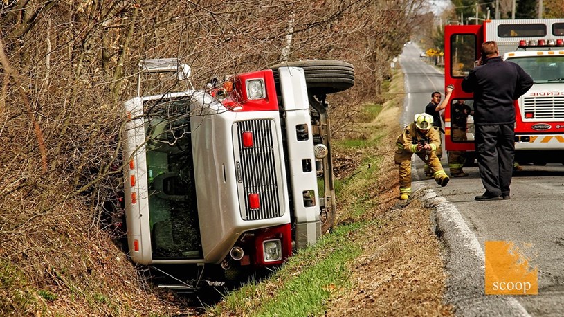 Le 29 avril dernier, alors que les pompiers rentraient en caserne à la suite d’une intervention, le véhicule transportant 2000 gallons d’eau s’est renversé sur le bord de la route, une centaine de mètres du lieu de l’intervention.