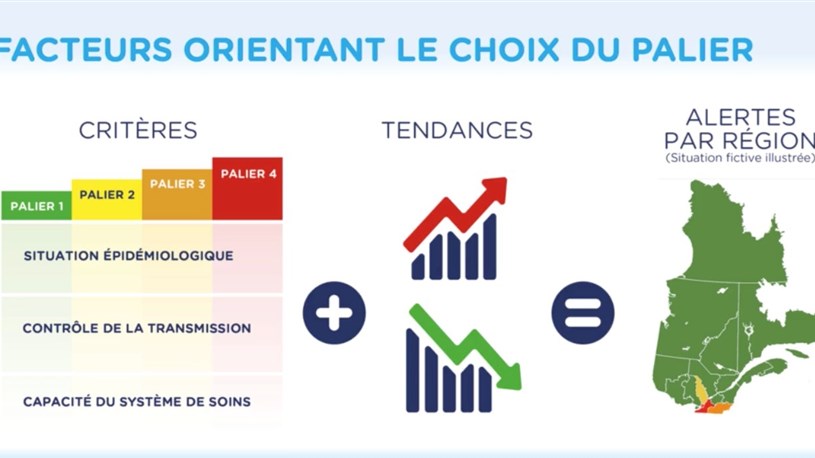 Les facteurs qui orientent le choix du niveau sont la situation épidémiologique, le contrôle de transmission et la capacité du système de soins [à traiter les cas]. L'addition de ces trois critères, avec la tendance du nombre de cas (à la baisse ou à la hausse), fixe le palier d'alerte pour chacune des régions administratives du Québec.