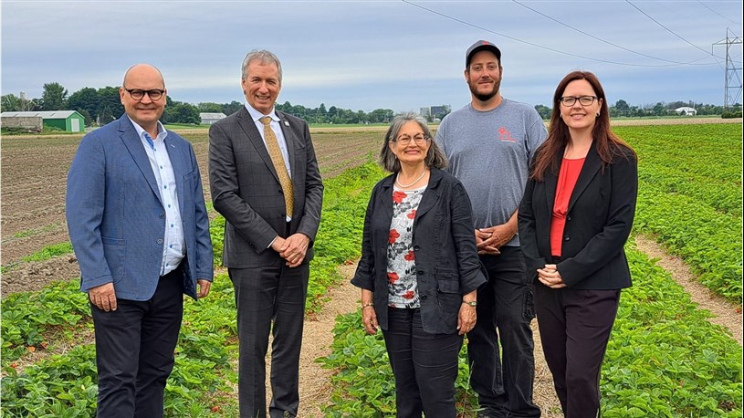 Sur la première photo, on retrouve: le député de Beauharnois, Claude Reid, le ministre de l'Agriculture, des Pêcheries et de l'Alimentation, André Lamontagne, Monique Thomas de l'Association des producteurs de canneberges di Québec, Alexandre Sauvé, propriété de la Ferme Hubert Sauvé et Jennifer Crawford de l'Association des producteurs de fraises et de framboises du Québec.