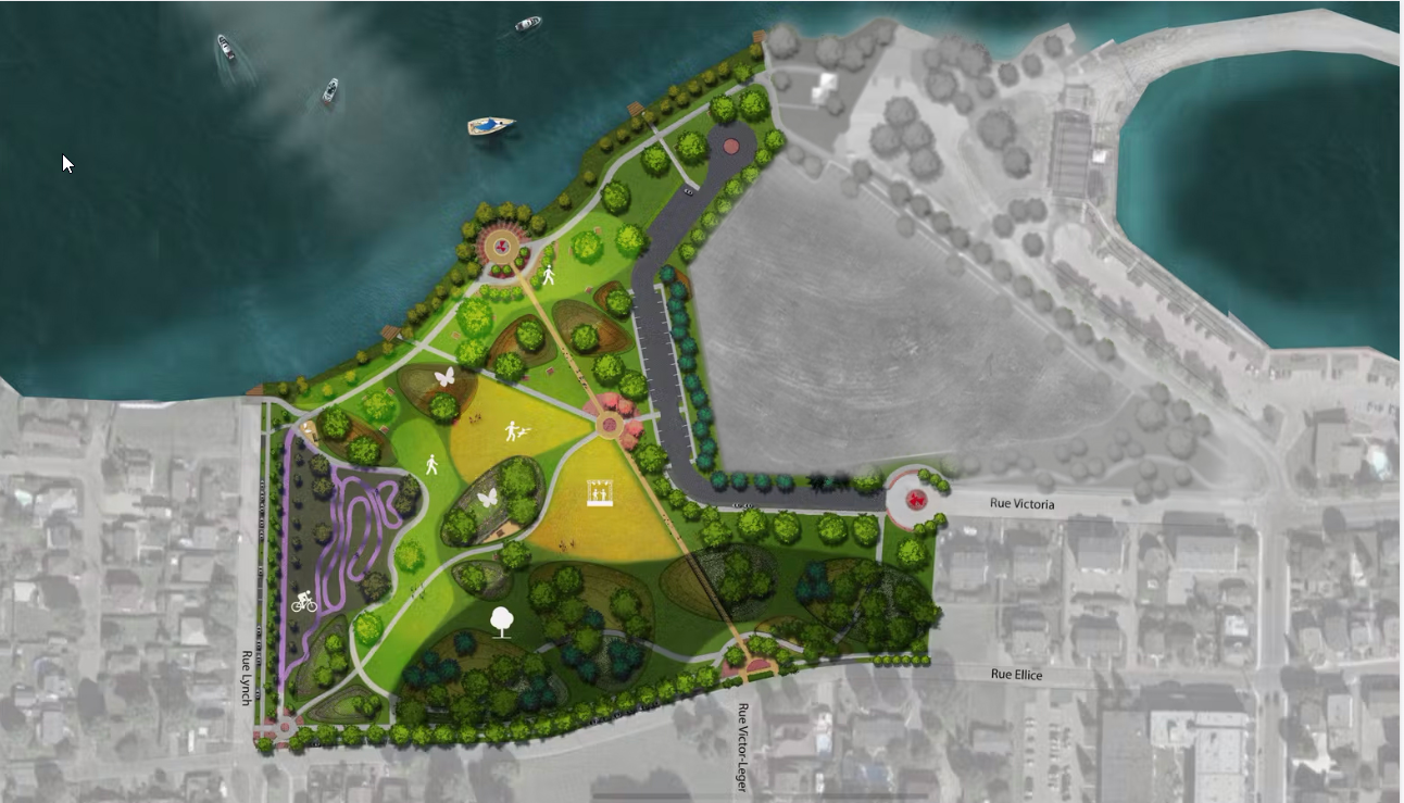Selon sa vision, l’endroit ayant une superficie de 1 million de pieds carrés sera transformé en un parc de destination aménagé et boisé. Un investissement de 6 millions de dollars a été confirmé pour la partie ouest. À terme, la phase 1 du projet comprendra l’aménagement de placettes, de mobilier urbain et de sentiers, en plus de la piste à vagues qui inclura des parcours pour débutants et enfants, intermédiaires et experts avancés.