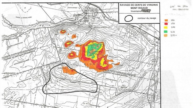 Carte du secteur du Mont-Rigaud démontrant les différents paliers d’altitudes, 1973