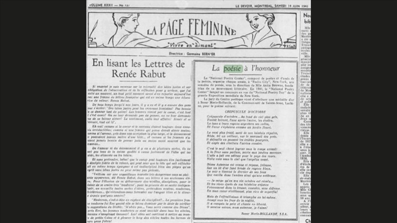 Poème écrit par Sr Marie-Rollande intitulé « Crépuscule d’octobre » paru dans le journal Le Devoir, p. 7, vol. 32, no 137 (?), le 1941-06-14. Poème gagnant du concours de New York.