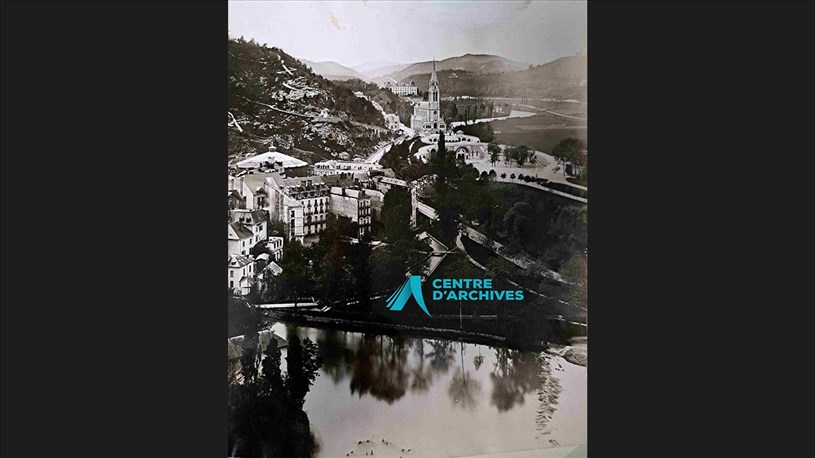 Photo du lieu de pèlerinage de Lourdes, France vu lors de son voyage en Europe, 1950.