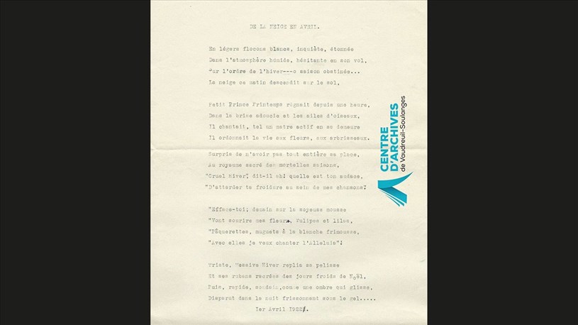 Poème intitulé « De la neige en avril » daté du 1er avril 1922.