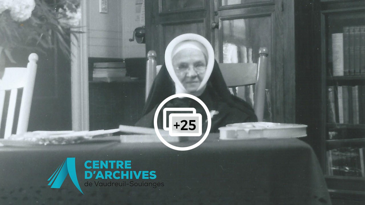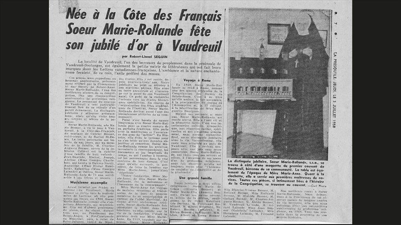 Article de journal illustrant le jubilé d’or titré « Née à la Côte des Français Sœur Marie-Rollande fête son jubilé d’or à Vaudreuil » paru dans le journal La Presqu’île, 3 juillet 1958, p.7.