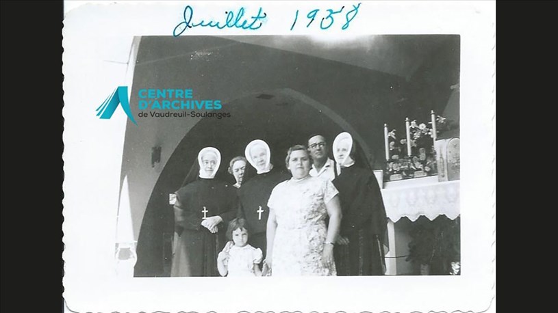 Photo sur laquelle on aperçoit Sœur Marie-Rollande entourée de sa famille lors de son jubilé d’or, juillet 1958.