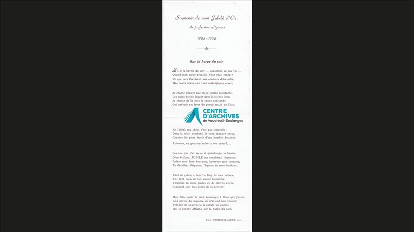 La page 2 du poème composé par Sr Marie-Rollande pour ses 50 ans de vie religieuse intitulé « Sur la harpe du soir ».