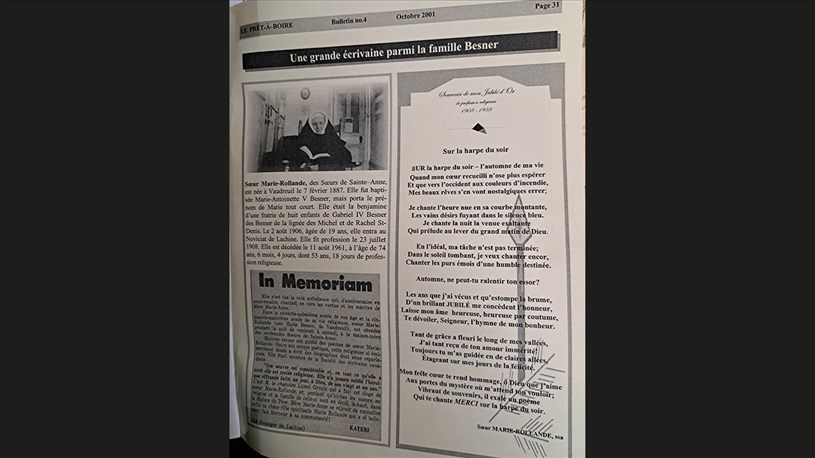 Article intitulé « Une grande écrivaine parmi la famille Besner » extraite de la revue Le Prêt-à-boire, bulletin no 4, octobre 2001, p.31.