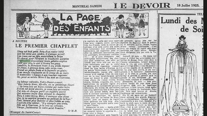 Poème ayant pour titre « Le premier chapelet » paru dans le journal Le Devoir, p.10, 1925-07-18.